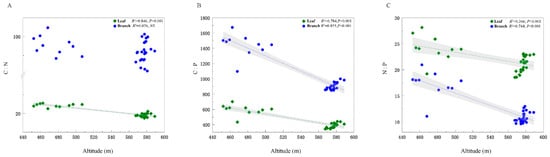 To reduce the effect of multicollinearity among the explanatory variables and the number of variables, a principal component analysis (PCA) was conducted on eight soil property variables. The PC1 (explaining 72.8% of the total variability) and PC2 axis scores (explaining 12.2% of the total variability) were included in the subsequent analysis (Table S1). The leaf C:N ratio was negative for PC1 (R2 = 0.433, p < 0.05) but there was no relationship with the branch C:N ratio (p > 0.05) (Figure 3A,D). Moreover, the explanation rate of PC1 to branch C:P (R2 = 0.433, p < 0.05) and N:P (R2 = 0.438, p < 0.05) ratios was higher than that of leaves (R2 = 0.367, p < 0.05; R2 = 0.164, p < 0.05) (Figure 3B,C); however, the explanation rate for PC2 showed an opposite trend (leaf C:N:P > branch C:N:P) (Figure 3D–F). Finally, leaf C:N, C:P, and N:P ratios, as well as branch C:P and N:P ratios, tended to decrease from low to high altitudes (Figure 4), although on scales ranging from 440 to 600 m above sea level, we found that branch C:N was not significantly corelated to altitude (Figure 4A).