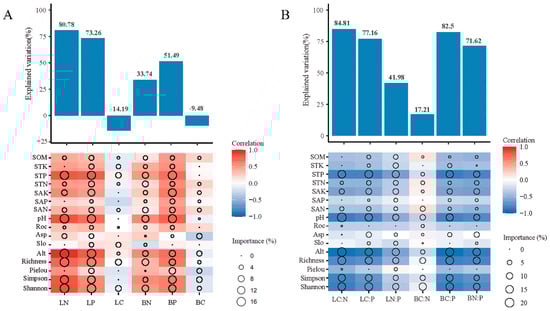 Soil properties, topography, and species diversity simultaneously included in the models predicted 48% and 94% variability in LC:N and BC:N, respectively (Figure 6C). Species diversity showed strong direct effects (0.69 and 0.33) and soil properties and topography showed weak indirect (−0.54 and −0.83) effects on LC:N and BC:N, respectively. The direct effect of LC:N on BC:N was the largest (0.71), while the indirect effects of topography and soil properties were −0.44 and −0.68, respectively. The path equation is as follows: ZLC:N = −0.37ZTop − 0.57ZSPP + 0.69ZSD(R2 = 0.48), ZBC:N = −0.44ZTop − 0.68ZSPP + 0.82ZSD + 0.71ZLC:N(R2 = 0.94). Similarly, other path equations can be obtained as follows: ZLC:P = −0.40ZTop + 0.27ZSPP + 0.99ZSD(R2 = 0.50), ZBC:P = 0.37ZTop−0.26ZSPP − 0.93ZSD – 0.94ZLC:P(R2 = 0.96); ZLN:P = −0.38ZTop + 0.73ZSPP + 0.91ZSD(R2 = 0.83), ZBN:P = 0.34ZTop + 0.17ZSPP + 0.22ZSD + 0.24ZLN:P(R2 = 0.22); ZLN = 0.38ZTop + 0.73ZSPP + 0.84ZSD(R2 = 0.70), ZBN = 0.28ZTop + 0.55ZSPP + 0.63ZSD + 0.75ZLN(R2 = 0.56); ZLP = −0.28ZTop + 0.49ZSP + 0.58ZSD(R2 = 0.33), ZBP = −0.32ZTop + 0.56ZSP + 0.66ZSD(R2 = 0.43).