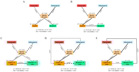 The strength of direct and indirect effects (standardized path coefficients) of topography, soil property, and species diversity on (A) leaf and branch P, (B) leaf and branch N, (C) leaf and branch C:N ratio, (D) leaf and branch C:P ratio, and (E) leaf and branch N:P ratio. Solid arrows indicate a positive relationship, and dotted arrows indicate a negative relationship. The numbers adjacent to the arrows are the standardized path coefficients and the arrow width indicates the strength of the standardized path coefficient. R2 values represent the proportion of the variance explained for each endogenous variable. χ2, chi-squared values; d.f., degree of freedom; GFI, goodness-of-fit index; RMSEA, the root mean square error of approximation. # p < 0.10, * p < 0.05, ** p < 0.01, *** p < 0.001.