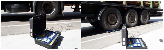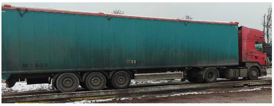 The static axle load for each individual axle was measured using a model DINI ARGEO WWSD portable truck scales with a 3590M309 weighing terminal, with an accuracy of 0.01 t (Figure 3). During the measurement, the scales were placed on a flat maneuvering area of hardened concrete paving blocks, with no depressions. The scale system used is fully compliant with Polish regulations and allows vehicles in transit to be weighed. The loads on the individual wheel axles were measured successively for the whole unit: the vehicle and the trailer. The weigh station was selected in such a way so as to maintain a horizontally placed road scale, so that the measured axles were kept horizontally (Figure 3).