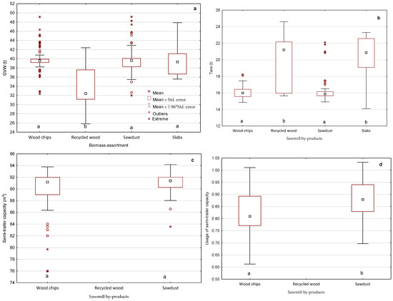 Characteristics of the transport sets depending on the sawmill by-product assortment: (a) GVW, (b) tare, (c) semi-trailer capacity, (d) usage of the semi-trailer capacity. Groups with dissimilar lower-case letters (a, b, over the x-axis) indicate significant differences, according to a Kruskal–the Wallis test or Dunn’s multi-sample rank mean comparison test.