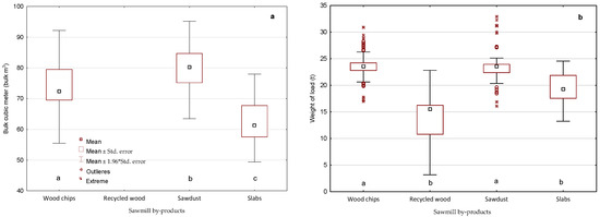 Characteristics of the deliveries depending on the sawmill by-product assortment: (a) bulk cubic meter, (b) weight of load. Groups with dissimilar lower-case letters (a, b, c, over the x-axis) indicate significant differences, according to a Kruskal–Wallis test or Dunn’s multi-sample rank mean comparison test.