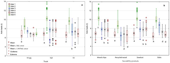 Distribution of the axle loads in the transport sets, according to: (a) transport set (TT(6)-six-axle set), (b) sawmill by-products assortment load. Groups with similar lower-case letters (a, b, c, d, under the box plots) indicate significant similarities, according to a Mann–Whitney test, Kruskal–Wallis test or Dunn’s multi-sample rank mean comparison test.