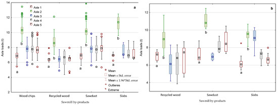 The type of transported sawmill by-products in the TST sets matters for the axle load of axles 3, 4, 5 (there are statistically significant differences), while for the truck axle (axle 1, 2) they do not depend (p = 0.205 and p = 0.125), which is a reasonable result since axles 3–5 are for semi-trailers (Figure 7a). The same is true for the axle loads in the TT sets (Figure 7b), but with lower statistical coefficients (p = 0.118 and p = 0.068). No analysis is presented for the six-axle TT sets, as they transported only one type of assortment-slabs.