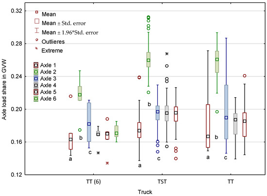 Distribution of the total gross vehicle weight of the transport set on its axles. Groups with similar lower-case letters (a, b, c, under the box plots) indicate significant similarities, according to a Kruskal–Wallis test or Dunn’s multi-sample rank mean comparison test.