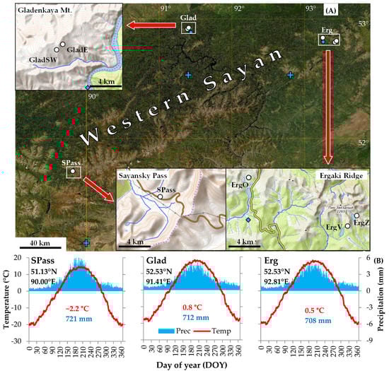 The study region: (A) satellite map (© ArcGIS) of the Western Sayan Mts. in Southern Siberia with locations of sampling sites (white circles), meteorological stations (blue diamonds), ERA-20C grid points closest to sampling sites (blue plus signs), and inserts depicting enlarged topographic maps of the study areas; (B) climatic diagrams of daily temperature (Temp, red lines) and precipitation (Prec, blue bars) averaged over the 1936–2010 period for the ERA-20C grid points closest to the sampling sites (coordinates are included in labels).