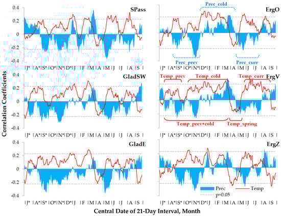Climatic response of P. sibirica radial growth: correlations of residual TRW chronologies SPass, GladSW, GladE, ErgO, ErgV, and ErgZ with 21 day moving series of temperature (Temp, red line) and precipitation (Prec, blue area) over the 1936–2010 period. Asterisks (*) mark months of the previous year; dashed horizontal lines mark the significance level p = 0.05. Brackets mark seasons of unidirectional responses (prev, previous vegetation season; cold, cold season; spring, early spring season; curr, current vegetation season).