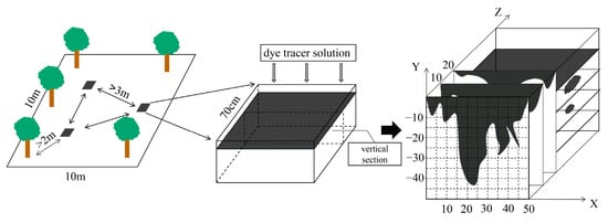Currently, the term hydrological connectivity is more frequently referred to and applied to a more comprehensive understanding of complex ecosystems [4]. Hydrological connectivity refers to the movement of matter, energy, solutes, and organisms through water flow within or between elements of the hydrological cycle [5]. Several studies have reported the effects of hydrological connectivity on ecosystem functions, e.g., the increased hydrological connectivity at the soil surface of semi-arid mountain slopes increases soil erosion potential and may cause desertification [6]. Higher hydrological connectivity at the soil surface of floodplain wetlands may contribute more to the improvement of the water quality [7]. The hydrological connectivity below the soil surface is also an important component that can significantly influence hydrological landscape processes [8]. Water cycling and connectivity within the soils rely more on root channels and soil pore space [9,10]. The transport of water and solutes influences the hydrological response within the soils [11]. Plant root channels and root-soil interfaces are important factors influencing soil hydrodynamics [12,13]. Water passes through the narrow space between the roots and the soil matrix under capillary action [14]. Root growth, pore spaces formed by decay, burrows created by the activities of soil organisms, and soil fissures can provide preferential transport paths for water and facilitate the redistribution of soil water. The water absorption of root systems promotes the redistribution of water within the soils and balances the potential difference between the wet and dry areas of soil [15], improving the hydrological connectivity within the rhizosphere. Many methods have been used to evaluate the hydrological connectivity of different ecosystems. Dai et al. [16] evaluated the function of wetland water resources using the dye tracing technique. Several scholars have evaluated the hydrological connectivity in certain types of ecosystems by building models or using parameters, such as a one-way linked subsurface-surface model [17], the network index [18], and the index of hydrological connectivity [19]. Hydrological connectivity has been studied for decades, and some methods, such as soil water content and topography, are developed to evaluate the hydrological connectivity. However, the index of hydrological connectivity can provide a better understanding to indicate the hydrological processes at micro- and macroscales compared to the existing traditional methods [20]. Furthermore, the index of hydrological connectivity can effectively indicate the changes in plant community both in space and time instead of a simple soil water content or topography [20]. The index of hydrological connectivity using the flow-length index is estimated in the previous case at macroscales based on remote sensing observations [21]. However, the index of hydrological connectivity below the soil surface using the dye tracing methods is not fully considered [22]. In fact, the index of hydrological connectivity below the soil surface can be obtained by field dye tracing experiments, which can actually reflect the hydrological connectivity within the soils, which is a novel method to evaluate the conditions and characteristics of water flow and solute transport. In fact, previous studies have applied the hydrological connectivity at the soil surface to the evaluation of the hydrological function of wetlands and watersheds [20,23] and have studied the factors influencing the hydrological connectivity, but the hydrological connectivity below the soil surface in forest soils has not been sufficiently studied.