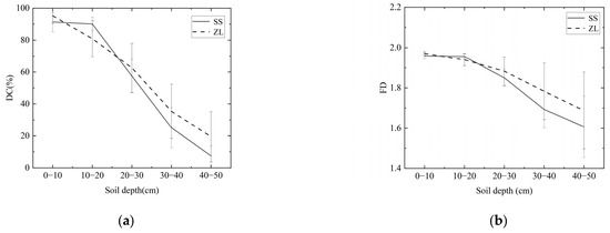 Change trend of DC and FD with increasing soil depth in the two sites: (a) Change trend of DC with increasing soil depth; (b) Change trend of FD with increasing soil depth.