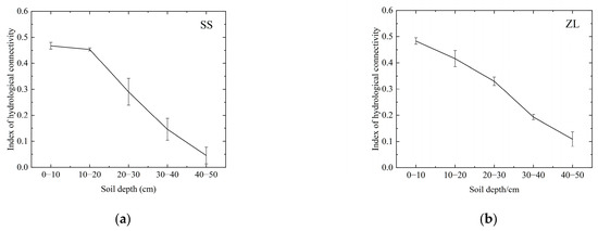 The soil’s physical properties, including the soil bulk density, soil porosity, and initial soil water content, affect the rate of water infiltration [49]. The lower initial water content of the surface soil increases the infiltration capacity of the water [50], which may explain the stronger hydrological connectivity of the surface soils in the pine forest (SS) compared to that in the bamboo forest (ZL). The total soil porosity is proportional to the rate of water infiltration, while the soil bulk density and initial water content are usually inversely proportional to the rate of water infiltration. Due to the high hydrological connectivity in the surface soil, the water infiltration into the top soil layer was more repaid. However, deeper soil layers with low water infiltration can lead to decreased hydrological connectivity. Furthermore, due to the lower root content in the deep soil, the soil capacity increases, the soil porosity decreases, and there are fewer preferential channels within the soils, so the connectivity of the water decreases. Finally, the amount of water that can infiltrate into the deeper layers of the soil is small and the IHC reaches a minimum value.