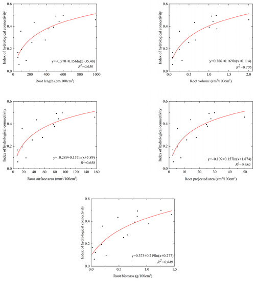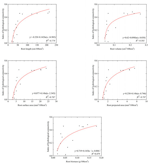 The parameters of root system architecture decreased with increasing soil depth in the SS and ZL sites, and the parameters in the bamboo forest (ZL) were significantly higher than that in the pine forest (SS) (p < 0.05) (Table 3). It was found that root systems were rich at the soil surface. Top soil layers (0–20 cm) got the maximum root systems content. Taking the root length as an example, the value of the root length was 198.87 (95%CI, 103.85 to 275.89) cm/100 cm3 in the 0–10 cm soil layer in the SS site, but it was 699.28 (95%CI, 69.65 to 1328.90) cm/100 cm3 in the ZL site. In the 40–50 cm soil layer, the value of the root length was 25.84 (95%CI, 11.29 to 40.40) cm/100 cm3 in the SS site, and it was 93.40 (95%CI, −39.36 to 226.16) cm/100 cm3 in the ZL site. Each root parameter was fitted to the IHC values using the logarithm equation. The results obtained were shown in Figure 5 and Figure 6. The results showed that each parameter of root system architecture (the root length, projected root area, root surface area, root volume, and root biomass) was well fitted with the IHC, which showed that these parameters of root system architecture and the IHC were positively correlated. The IHC values increased with increasing parameters of root system architecture.
