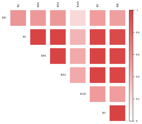 Pearson correlation analysis was conducted between the IHC and the various parameters of root system architecture. The results were presented in Figure 7. The results showed that the parameters of root system architecture were significantly positively correlated with each other (p < 0.05). Among those parameters, the RL was more correlated with the IHC (r = 0.57, p < 0.01), whereas the relationship between the RAD and the IHC was not significantly different (r = 0.21, p > 0.05).