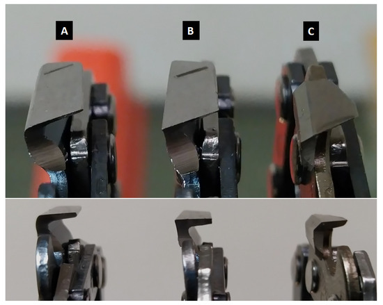 The different shapes of saw chain cutters used in the experiments: A—semi chisel, B—full chisel, C—chamfer chisel.