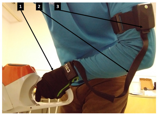 Feed force monitoring system: 1—glove with pressure sensors, 2—data cable, 3—data box/Bluetooth transmitter.
