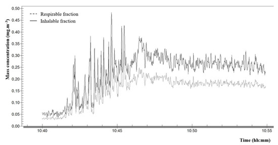 Temporal variations in the mass concentration of inhalable/respirable dust while cross-cutting spruce wood with a full chisel chain. Cross-cutting started at 10:41 and ended at 10:46.