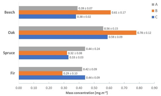 Effect of cutter shape (A—semi chisel, B—full chisel, C—chamfer chisel) and wood species on respirable mass concentration (arithmetic mean ± standard deviation, n = 10).