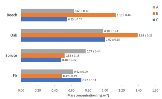 - Oak wood generated the highest average dust mass concentration, followed by beech wood, fir wood, and spruce wood. A statistically significant difference was found between examined wood species, with only three exceptions.