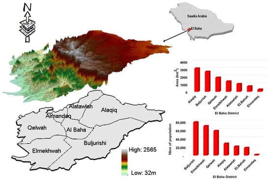 A Digital Elevation Model (DEM) is an illustration of the bare earth (bare ground) topographic of the Earth’s surface including buildings, trees, mountains, and any other surface objects. The Shuttle Radar Topography Mission (SRTM) databases with a resolution of ~30 m (1 arc-second) of the U.S. Geological Survey were downloaded from [35]. The elevation of the study area is between 32 and 2600 m above sea level. The Al Baha, central Buljurshi, southern Alaqiq, and Alatawlah districts are localized at high altitudes between 1500 and 2500 m, whereas Qelwah and Elmelkhwah districts are located between the elevations of 32 and 1070 m, where low altitudes of approximately 32 m (Figure 1 and Figure 2a) characterize their southern parts.