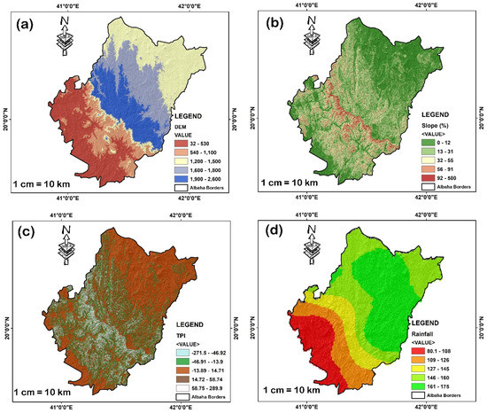 The database of the water lines (river) and roads lines were obtained from the Global Map Saudi Arabia version 2 downloaded from [41]. The river networks (Figure 3a) explained by the Sarawat mountain range extend from the south to the north in the Al-Baha region and occupy a very large area. This mountain range is a major dividing line for water in the region, from which a number of valleys come, which generally go to the north-east towards the interior parts of the Kingdom, the largest of which are Wadi Turbah and its tributaries, such as Wadi Bathan (Baida), Wadi Amaq, and Wadi Kara. In addition, the upper valley of Rania starts from the Al-Baha region and its tributaries in the region: Wadi AlAqiq, Wadi Nagra, Wadi Abad, Wadi Tharad, Wadi Jerash, and Wadi Bani Kabir. At the same time, a number of valleys descend from the region, which generally move towards the west to flow into the Red Sea, including Wadi Alib, Wadi Duqa, Wadi Qarma, Wadi Naira, Wadi Nawan, and Wadi Al-Asab. The torrential waters flow into the valleys in the Al-Baha region, often during the rainy seasons, because the upper parts of its streams consist of poorly permeable rocks and are characterized by steep slopes [42].