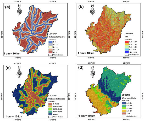 Representation of (a) distance to the water lines, (b) topographic wetness index, (c) distance to the road, (d) wind speed.