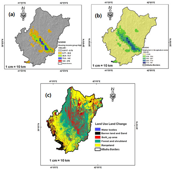 Representation of (a) housing high-income group map, (b) employment in the agriculture sector, and (c) land use land change.