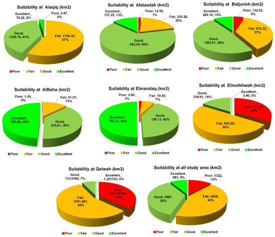 The results of GI suitability are illustrated in Figure 7 and Figure 8, while Figure 7 explains in detail the area of different forms of suitability in the area and percentage for each district of the Al Baha region. The results revealed five classes of suitability and no suitability (poor, fair, good, and excellent), which are mapped in Figure 8. The first class was “poor suitability” which represented 12% (1322 km2) of the total area of the Al Baha region (11,104 km2), which was observed more in Qelwah and Elmelkhwah with an area of approximately 697 (37%) and 471 km2 (34%), followed by Buljurshi with a contribution area of 5% (132 km2) (Figure 7 and Figure 8). The other districts did not exceed a poor area of 12 km2. The second class “fair suitability” covered the largest part of the area; it explained 43% of the total area of the Al Baha region, which was equal to 4808 km2. A fair suitable area was detected in the Alaqiq, Qelwah, Elmelkhwah, and Buljurshi districts; it occupied large areas of 1766 (57%), 1051 (56%), 693 (50%), and 975 km2 (37%) (50%), respectively (Figure 7 and Figure 8). The fair area in Al Bahah, Alatawlah, and Elmandaq was between 19 and 91 km2. The third class corresponded to good suitability; it represented 36% (3987 km2) of the total area. The areas of “good suitability” were observed more at Buljurshi Alatawlah, El Bahah, and Elmandaq with areas of 1283 (48%), 692 (66%), 278 (38%), and 126 km2 (42%), respectively (Figure 5 and Figure 6). The fourth class illustrated the areas of “excellent suitability” and explained the lowest area estimated at 983 km2 (9%). The excellent suitability was observed more at Al Bahah and Elmandaq with areas of 355.9 (49%) and 152 km2 (49%), respectively (Figure 7 and Figure 8). This is why Al Bahah and Elmandaq are the most urbanized districts in Al Baha region. The western central part of Buljurshi also revealed a suitable area for GI of 260 km2 (10%). Conversely, Qelwah did not have a suitable area for GI due to its location in the mountains and in barren and sand areas.
