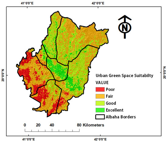 The results obtained by this study regarding GI suitability agreed with the current geographic location of green infrastructure in the Al Baha region, where the most excellent suitable areas for GI planning have been detected and suggested in the areas of Al Bahah, Elmandaq, and the western central part of Buljurshi, where these districts contain famous forests. Where the Al-Baha district sits between the Sarat mountain range and the Tihama plains, it resembles hanging cities, which make its atmosphere very wonderful. Al Baha forests constitute about 80% of the total area of the area, which is surrounded by many parks, gardens, and heritage villages. Its mountainous nature and unique forests make it a natural and heritage tourist destination in all seasons of the year. Raghadan Forest is located 5 km north of Al Baha. It is one of the most famous forests in Al-Baha, which is characterized by a moderate climate throughout the summer days, and the density of vegetation cover dominates the beauty of this forest, which is located in an area of more than 800 thousand square meters, interspersed with shaded areas for rest. Al-Habaka forests are distinguished by their location as they are adjacent to the main road linking the regions of Al-Baha and Asir through Al-Sarat, which makes it a tourist stop for travelers throughout the year and provides a great outlet for visitors. What increases the components of this park amid its various activities and services is the flow of its river throughout the year and the density of its wild trees such as mountain olive trees, juniper, acacia, and other trees, which make it a favorite destination for families [70]. The forests and parks of Al-Janabin valleys in the Buljurshi district contain evergreen trees such as olives, acacia, and juniper are abundant, which attract many families. Perhaps what distinguishes these forests and valleys and makes them a tourist destination is that they include archaeological inscriptions scattered on the sides of the valleys and traces of ancient villages, some of which date back more than a thousand years [70], in addition to the Alaqiq forest, which is located 40 km from El Bahah district. For this reason, the city of Al-Baha is considered one of the most attractive cities in the Kingdom of Saudi Arabia for tourists because of the charming nature of this wonderful region. These results of urban concentration explain the great contribution of GI and UGS to well-being, which agrees with the studies in [71,72,73,74,75]. A survey from 2001 to 17 for Melbourne (Australia) [71], reported that UGS access levels are associated with higher well-being levels, especially large UGS areas with green corridors. In the framework of the sustainable development of urban slum areas in northwestern Spain, the authors of [76] reported that the green economy policies are one of the good choices for improving the development of the population and quality of life. In relation to the spatial disparity patterns of buildings and green space (GS), the case of arid urban areas in Sohar wilayat (Oman) assessed by the authors of [77] indicated that the large numbers of GS areas in the majority of neighborhoods were linked with large population size. In the Heritage community park and the Huckleberry Trail and natural area in Blacksburg, Virginia, the authors of [78] examined the impact of GI on human health and well-being. The results showed that visitors that use green infrastructure have positive psychological benefits and attachment to the places with higher psychological and physical health benefits, especially for females. Regarding the relationship between GI and health, the author of [79] concluded that a larger GI has been related to reduced temperatures, air pollution, violence, and crime. On the other hand, although there is some evidence of decreased mortality and good health, this relationship is considered less so with health. A study was carried out between 2012 and 2014 regarding green infrastructure as life support. The study documented that green infrastructure has diverse benefits such as the modification of climatic conditions and temperature, improved well-being and human health, enhanced community liveability, increased economic prosperity, more extensive urban food production, and greater opportunity for biodiversity conservation [79].