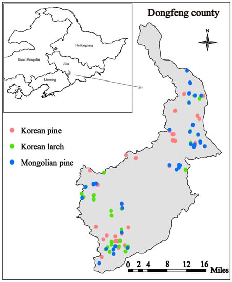 The study was conducted in Dongfeng County in the south of Jilin province, northeastern China (125°3′ E–125°5′ E, 42°18′ N–43°14′ N) (Figure 1). Dongfeng County is located in the Haddaling remnant of the Changbai Mountain branch, with a forest area of about 113,800 hectares. The main topographic feature of Dongfeng County is hilly terrain with altitudes ranging from 300 to 914 m. The climate type of Dongfeng County is a monsoonal zone with a moderate, temperate, humid climate. The average annual temperature is 4.5 °C, with a range of −37 °C to 35 °C. The average annual precipitation is 672.9 mm, with a range of 451.9 mm to 867.5 mm. Soil types are mainly dark brown soil, albic soil, meadow soil, and alluvial soil.