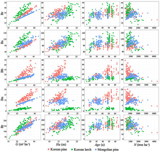 Scatter plot of total and component biomass (total (Bt), root (Br), stem (Bs), branch (Bb), and needle (Bn)) versus basal area (G), stand dominant height (Ha), stand age (Age), the number of trees per hectare (N).