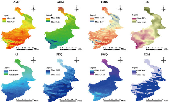 The information on climate variables in the study area. AMT, AHM, TMIN, ISO, AP, PDQ, PWQ, and PDM are annual mean temperature, annual heat moisture, minimum temperature, isothermality, annual precipitation, precipitation of driest quarter, precipitation of wettest quarter, and precipitation of driest month, respectively.