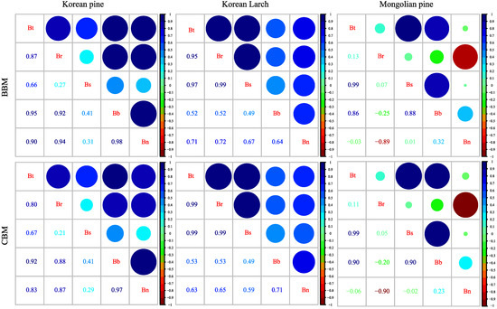 The BBMs and CBMs were fitted by the simultaneous equations with NSUR in the model fitting, which considered the inherent correlation between the components. In addition, the constraint of a logical biological feature was that the total was equal to the sum of the components. Therefore, a constant 5 × 5 matrix was assumed with cross-correlations among five equations. This study contained six constant matrices for BBMs and CBMs of Korean pine, Korean larch, and Mongolian pine. The residual correlation matrices between the stand total and components are shown in Figure 4. There were multiple close correlations between the total and the components or between the different components for the Korean pine. The correlations were closer between the total, the roots, and the stems and between the roots and the stems for the Korean larch. In comparison, the closer correlations of the Mongolian pine were shown in the total and the stems, branches, the stems and branches, the roots, and the needles. The correlations of the system of CBMs and BBMs were slightly different. Even if no climate variables were introduced in a component of the CBMs systems, the NSUR cross-equation constraints changed the correlations.