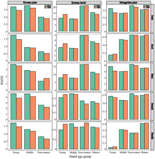 To compare the differences in the stand biomass estimates of the BBMs and CBMs and the predicted values of the stand total and the components biomass obtained by the LOOCV, this study tested the differences of three species in several age groups. The RMSE was selected to measure the difference (Figure 5). As one of the characteristics of Korean pine is that it is a slow-growing species, the age groups of its young, middle, and near-mature forests are 0–40 years, 41–60 years, and 61–80 years, respectively. The age groups of the Mongolian pine and the Korean larch are 0–20 years for the young forest, 21–30 years for the middle forest, 31–40 years for the near-mature forest, and 41–60 years for the mature forest [46].