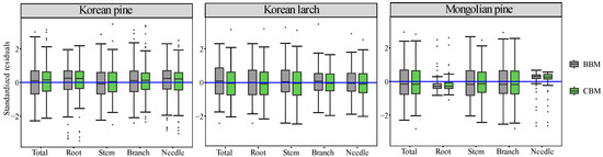 The box plot of standard residuals against the stand total and components of BBMs and CBMs for three conifer species. The boxes express the interquartile ranges. The upper and lower horizontal lines crossing the vertical bars represent the maximum and minimum standard residuals.