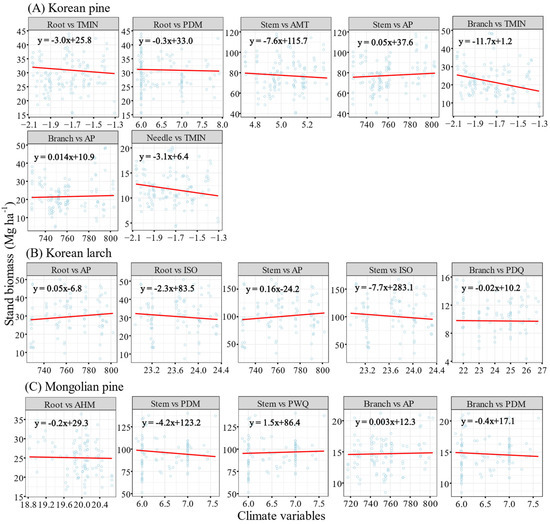 Plots of stand component biomass to climate variables for (A) Korean pine, (B) Korean larch, and (C) Mongolian pine. The red line in each plot is the estimate of the smooth function (linear model) that simulate the effects of climate change on stand component biomass.