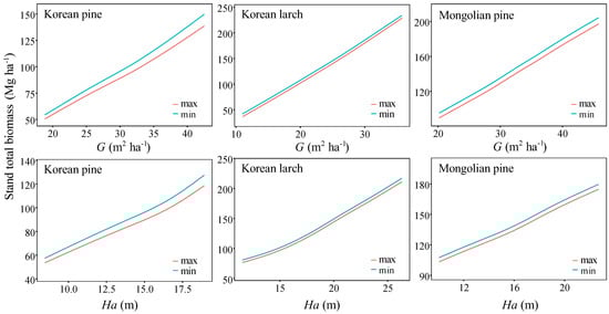 To further evaluate the effect of climate change on the stand biomass for three conifer species, the CBMs were used to simulate the response of the stand component biomass to climate variables (Figure 7). The positive and negative effects of climate variables on the stand components biomass were consistent with the positive and negative parameter estimates of CBMs. The stand component biomass increased with AP and PWQ, and decreased with AHM, AMT, ISO, TMIN, PDM, and PDQ. In terms of the slope of the smooth linear model, the slopes range from −4.2 to 1.5 for precipitation-related climatic variables (AP, PDM, PDQ, and PWQ) and from −11.7 to −2.3 for temperature-related climatic variables (AMT, ISO, and TMIN). Temperature-related climatic variables have a greater effect on component biomass than precipitation-related climatic variables. The combined climatic variables of temperature and precipitation (AHM) had a small effect on root biomass (slop is −0.2). Meanwhile the sensitivity of stand total biomass to two climatic gradients (minimum and maximum) were also tested, and the curves of predictive simulation were plotted (Figure 8). The total biomass increased when G and Ha increased, and decreased when climate variables increased. The rate and range of curves varied with three species. The magnitude of climate effect ranked the species Korean pine > Mongolian pine > Korean larch.