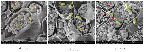 The microstructure of “jdy”, “dhp”, and “eur” cultivar starch granules were examined by scanning electron microscopy (SEM) (Figure 2). The overall microstructure of kernels was presented as a honeycomb-like structure (porous starch structure). The starch granule morphology in three chestnut cultivars showed a slight difference, since there were more honeycomb holes observed in “eur” than in “jdy” and “dhp” (indicated by red arrows). The shape of starch granules was oval, round, or asymmetric polygonal and the particle size of the starch granules varied from 5 to 19 μm. The particle size of starch granules may be related to the starch content.