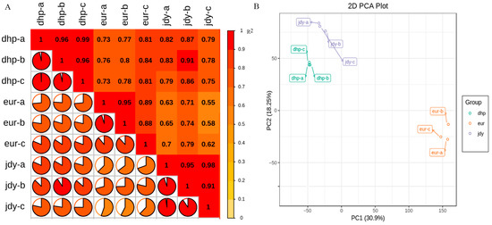 Pearson correlation matrix (A) and principal-component analysis (B) of differentially expressed genes (DEGs) were performed on sequenced sample sets to assess correlations and variance between samples. “dhp”, “eur”, and “jdy” are the names of the three chestnut cultivars. a/b/c represent the 3 biological replicates.