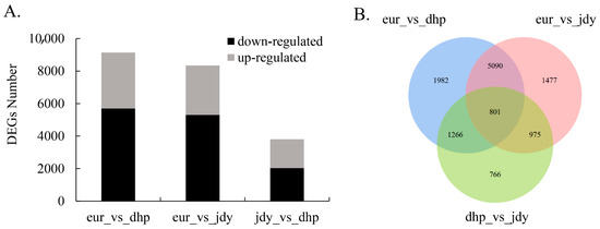 In this study, DEGs with |log2 fold change| ≥ 1 and FDR < 0.05 were measured and found to be significantly different. A total of 3449, 3041, and 1766 genes were upregulated and 5690, 5302, and 2042 genes were downregulated between “eur” vs. “dhp”, “eur” vs. “jdy”, and “jdy” vs. “dhp”, respectively (Figure 4A,B). According to the results (Figure 4A,B), there were more DEGs among “eur” vs. “dhp” and “eur” vs. “jdy” than “jdy” vs. “dhp”, which revealed a closer relationship between “jdy” and “dhp”.
