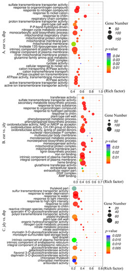 GO enrichment analysis of DEGs. Advanced bubble chart depicts enrichment of DEGs in different pathways. (A) “eur” vs. “dhp’; (B) “eur” vs. “jdy’; (C) “jdy” vs. “dhp”. Sum denotes the number of DEGs and rich factors are considered to be the ratio of DEGs in each GO analysis compared with total number of DEGs.