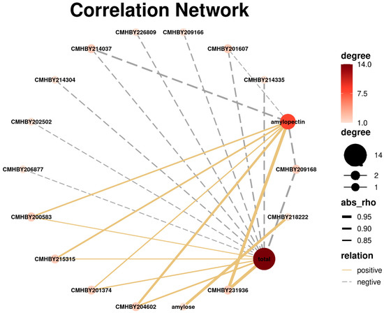 Correlation networks between the starch concentrations (amylose, amylopectin, and total) and the starch biosynthesis-related gene expression profiles. Solid yellow lines represent positive and dotted gray lines represent negative correlation, whereas dot size/color denotes the quantity of correlated objects.