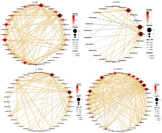 Correlation of expression profiles between the four TF families ((A) ERF; (B) bZIP; (C) MYB; and (D) WRKY) and starch biosynthesis-related genes. Solid yellow lines denote positive and dotted gray lines represent negative correlation; dot size/color denotes the quantity of correlated objects.