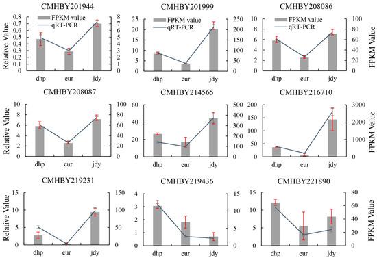 Nine genes were selected for qRT-PCR assays to validate the accuracy of RNA-seq data (three biological repeats per samples). The expression of CMHBY208087 in “eur” was used as a control. The qRT-PCR results overall displayed a close correlation with the RNA-seq data (Figure 9).