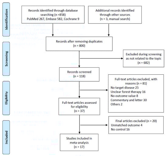 During the initial search, we identified 861 articles from different electronic databases (PubMed, n = 267; Cochrane, n = 9; Embase, n = 582) and manual searches (n = 3). Sixty-one studies that contained overlapping data or appeared in more than one database were excluded. After screening the titles and abstracts, 682 studies were eliminated because they were unrelated to the topic in question. Of these, 81 studies were excluded for the following reasons: no target diseases (n = 25), unclear forest therapy (n = 16), no outcome value (n = 8), commentary or letter (n = 30), and others (n = 2). Finally, 17 studies met our selection criteria for the qualitative and quantitative syntheses (Figure 1).