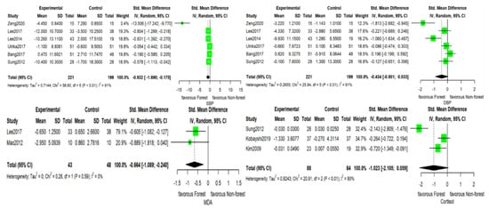 All variables with improvements were recorded as continuous data. SMDs (Hedges’ g) with 95% confidence intervals (CI) and the DerSimonian and Laird random-effects model were used to adequately analyze the overall SMDs, and because each study had a different follow-up period, the outcome value recorded at the end of the study was used [3].