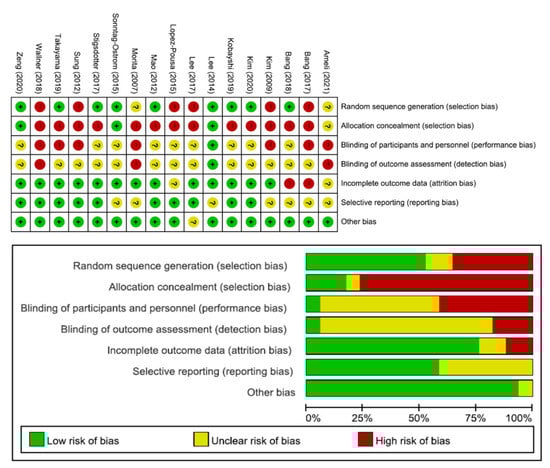 Summary of the risk of bias assessment. Refs are [8,10,11,12,13,14,15,17,18,20,21,22,25,30,31,32].
