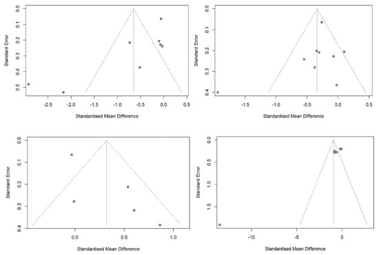 Publication bias was evaluated using the method shown in Figure 6. The funnel plots of the SMDs resulting from forest therapy appeared asymmetrical for all outcomes owing to insufficient observations. The p-values obtained through Begg and Mazumdar’s correlation and Egger’s regression coefficient tests suggest evidence of publication bias or small-study effects in this meta-analysis; this was not observed for the depression and well-being scores.