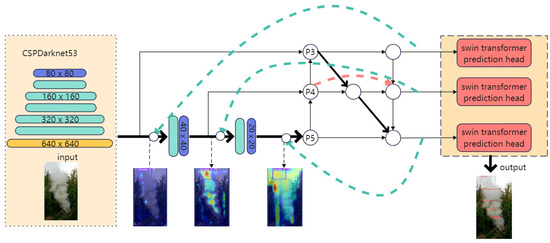 Aimed at the above problems, this paper constructs a Recursive BiFPN attention model and introduces it into the backbone network of YOLOV5 to extract and fuse the multi-scale features of smoke images in order to better distinguish the subtle difference between smoke from clouds and fog. Zhu et al. [26] proposed a Transformer Prediction Head (TPH for short) for small target detection. To better capture the features in different scales, Shifted Window Transformer [27] was presented to meet the needs of fine-grained forecasting. Inspired by [27], we introduce the Shifted Window Transformer (Swin-TPH for short) to replace prediction head of YOLOV5, which contributes to increase the detection accuracy of small smoke.