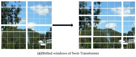 Following the operation of backbone and neckbone, the prediction head identifies fire smoke according to the extracted features. In order to detect small smoke regions in images, inspired by [26,27], we replaced the prediction head of YOLOV5 with a Swin Transformer to improve the ability of detecting small smoke regions. Different from TPH, a Swin Transformer calculates self-attention only within non-overlapping windows, and thus the locality operation has a near-linear time complexity in the size of the input image. Moreover, as the network depth increases, image patches can be gradually merged to build a hierarchy structure.