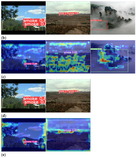 Swin-TPH assigns different weights for specific feature layers to detect small smoke in the images shot at a long distance or in an early fire, as shown in Figure 5. This is because the SW-MSA mechanism of Swin-TPH can form different receptive fields with different smoke areas by building a hierarchical structure. Furthermore, our model also has high detection accuracy for brown, black and other thick smoke except white smoke, because non-overlapping local windows and overlapping cross-window operations enhance the ability of local feature representation and global modeling.