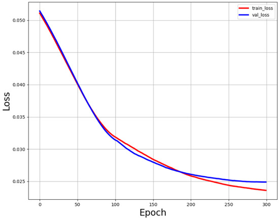 Training and validation loss curves for our network. The red line and the blue line represent the changes in the loss function generated during training and validation, respectively. The model gradually converges from 200 epochs.